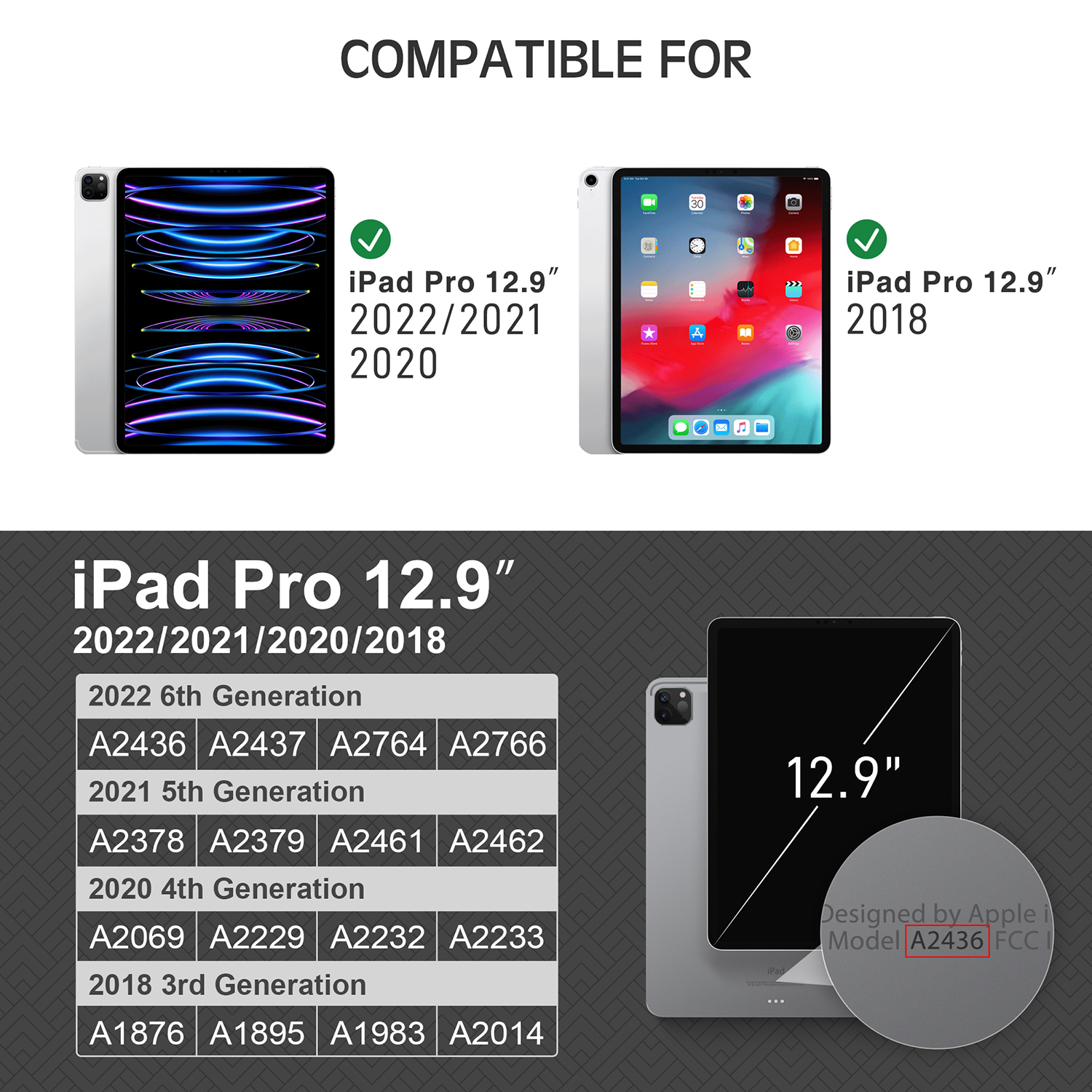【Perfect Match】 Designed for New iPad Pro 12.9 inch 6th Generation 2022 (A2436/A2764/A2437/A2766), 5th Generation 2021(A2378/A2461/A2379/A2462), 4th Gen 2020(A2229/A2069/A2232/A2233), 3rd Gen 2018 (A1876/A2014/A1895). ⚠️Notice: Only fit for iPad Pro 12.9 2021/2020/2018. NOT fit for other model.